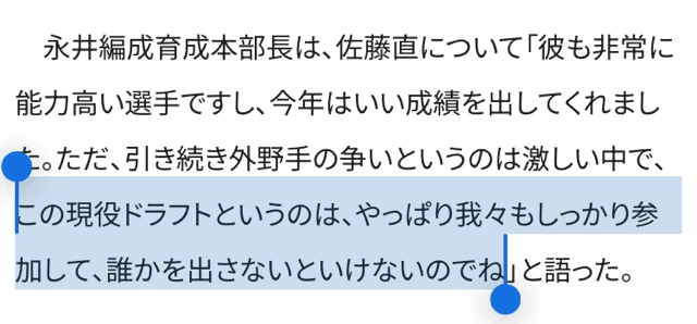 意外やな。正直石塚か山本かと思っていた。まあ、現役ドラフトは出場機会に恵まれない選手に新たな活躍の場を提供する制度だから、今年104試合出場5本塁打10盗塁の佐藤直樹が出されるのも理解できるなあ()
